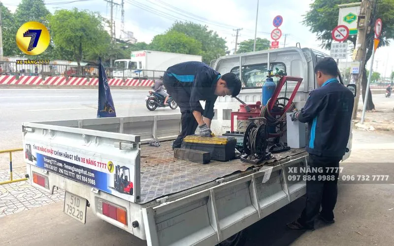 Xưởng dịch vụ di động: Các xe dịch vụ của Xe Nâng 7777 được trang bị như một xưởng sửa chữa thu nhỏ. Bao gồm máy đọc lỗi chuyên dụng, đầy đủ dụng cụ cơ khí, và kho phụ tùng phổ biến. Hơn 80% lỗi thông thường được xử lý và khắc phục ngay tại kho bãi của khách hàng.