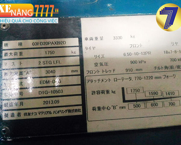 - Sức nâng 2000kg, Chiều cao nâng 3040mm,