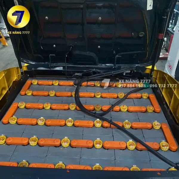Bình điện được bố trí phía sau xe, giúp cân bằng trọng tâm, tối ưu độ ổn định khi nâng tải và dễ dàng thay thế – bảo dưỡng.