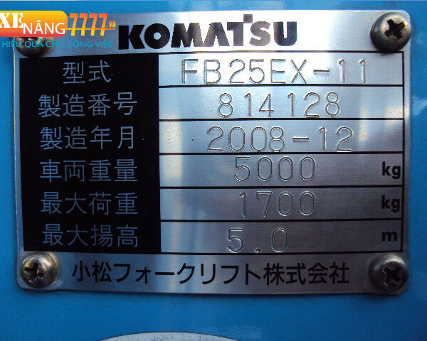 - Sức nâng 2500kg, chiều cao nâng 5000mm, khối lượng xe 5000kg, năm sản xuất tháng 12 năm 2008