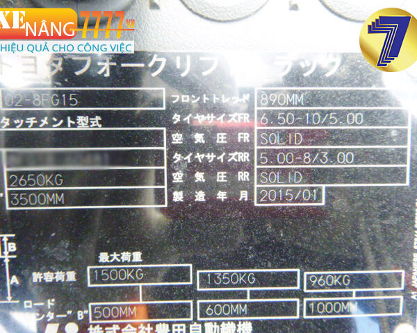 - Sức nâng 1500 kg, Chiều cao nâng 3000 mm,